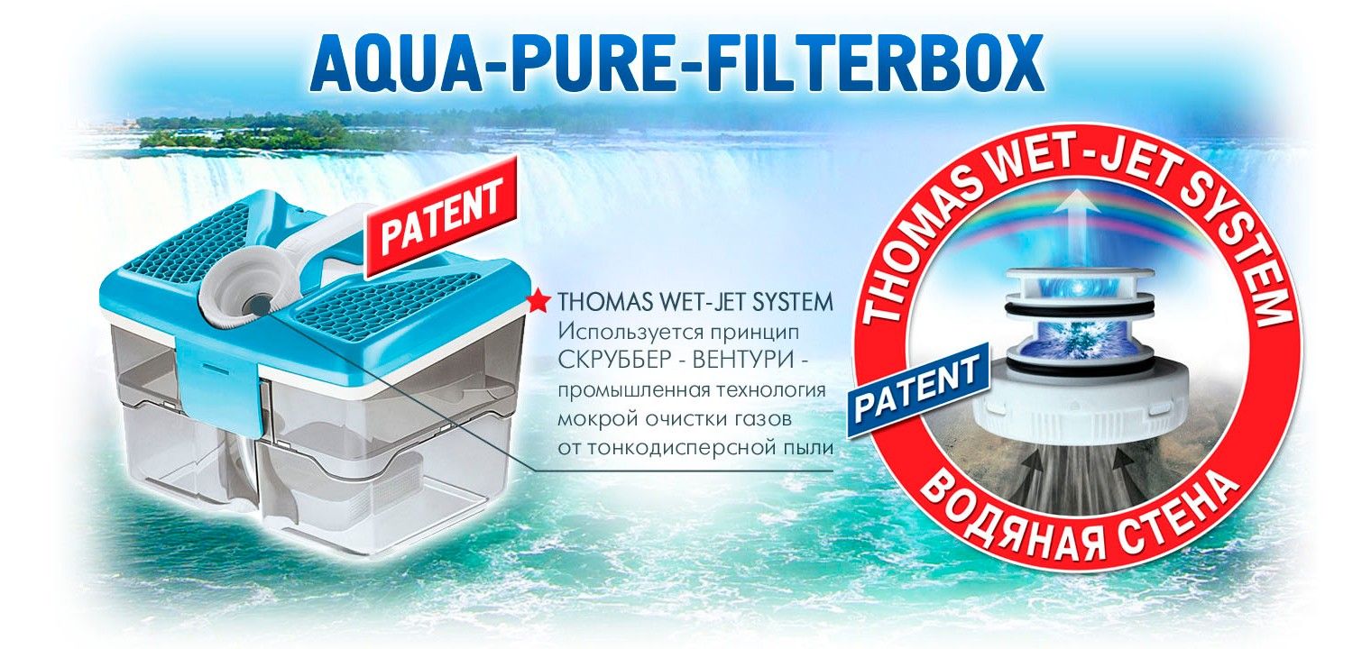 Aqua-Pure-Filterbox является уникальным водяным фильтром — сочетанием природной очистки воздуха водой (эффект дождя) и аэродинамического устройства –"THOMAS WET-JET SYSTEM", создающего вакуум для подачи воды и распыления её во входящий пылевоздушный поток.