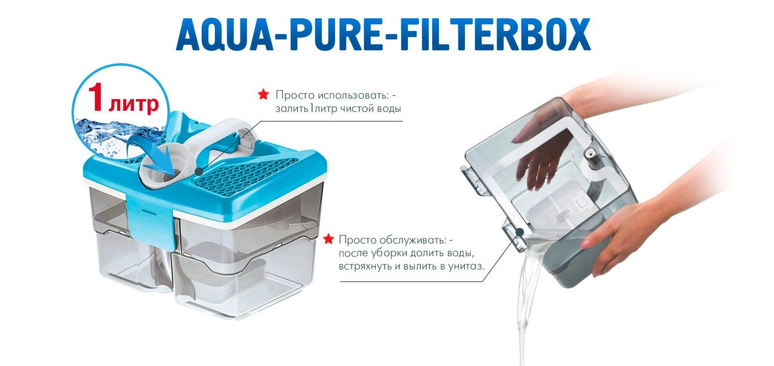 Aqua-Pure-Filterbox легко использовать и легко мыть: для начала уборки нужно залить в емкость 1 л воды, а по окончании уборки просто вылить воду вместе с грязью и ополоснуть аквабокс.