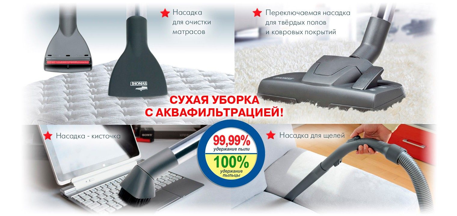 Сухая уборка при помощи THOMAS PERFECT AIR ALLERGY PURE — это тщательная очистка ковров, мягкой мебели и твердых напольных покрытий, а также бережный сбор пыли и мусора на деликатных поверхностях (полированная мебель, техника и т.п.) и глубокая чистка матрасов при помощи специальных насадок.