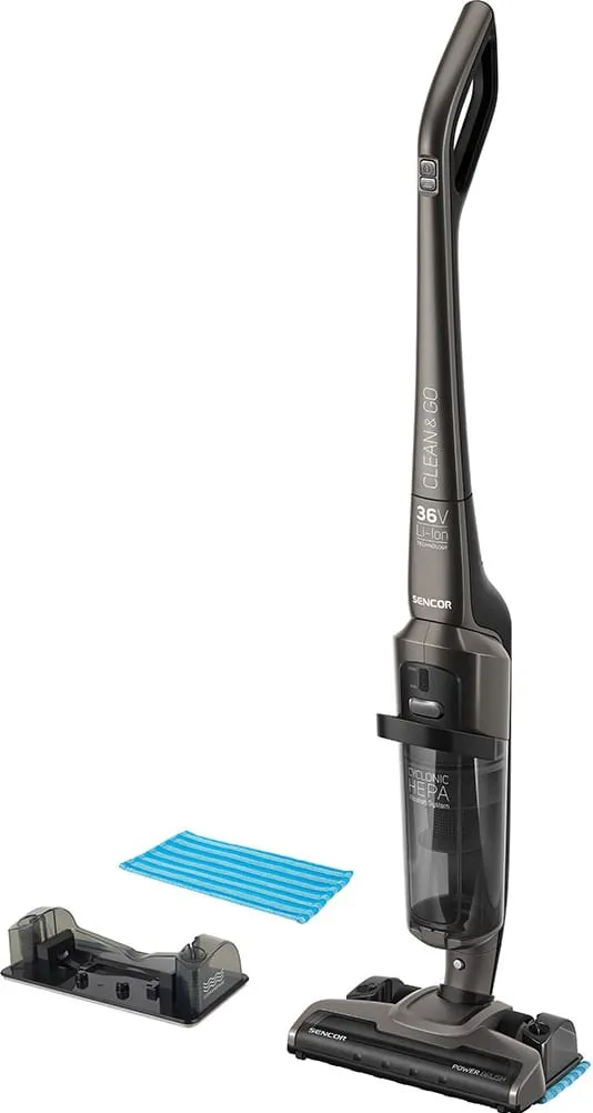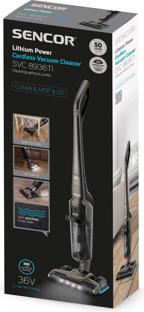 -       Описание      Sencor SVC 8936TI — беспроводной вертикальный пылесос‑«палка» 2‑в‑1 с функцией влажной уборки. Оснащён мощным литий‑ионным аккумулятором 36 В / 2,15 А·ч, который обеспечивает до 60 мин работы от заряда. Уровень шума — 78 дБ. Контейнер для пыли без мешка объёмом 1 л. Фильтрация HEPA, циклонная технология. Электрощётка с независимым мотором, режимы работы: 2 скорости, есть LED‑подсветка насадки. Вес устройства около 2,7 кг, габариты примерно 1091×262×212 мм. Цвет — чёрный. - * Характеристики и комплектация товара могут изменяться производителем без уведомления.