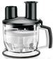 Основной инструмент блендера BRAUN MQ 7075 X BK – это венчик, большой измельчитель, мерный стакан, насадка блендерная ножка с подвижными лезвиями ActiveBlade: они плавно перемещаются вверх-вниз. Данная технология позволяет до 40% минимизировать усилия, которые ранее вам бы пришлось прилагать, при использовании «обычного» прибора. Венчик-взбиватель – многофункциональный аксессуар, который подходит как для быстрого взбивания яиц, так и для прочих, самых разных задач по вашему усмотрению. Пластиковый мерный стакан имеет емкость 600 мл и мерную шкалу на боковой стенке.