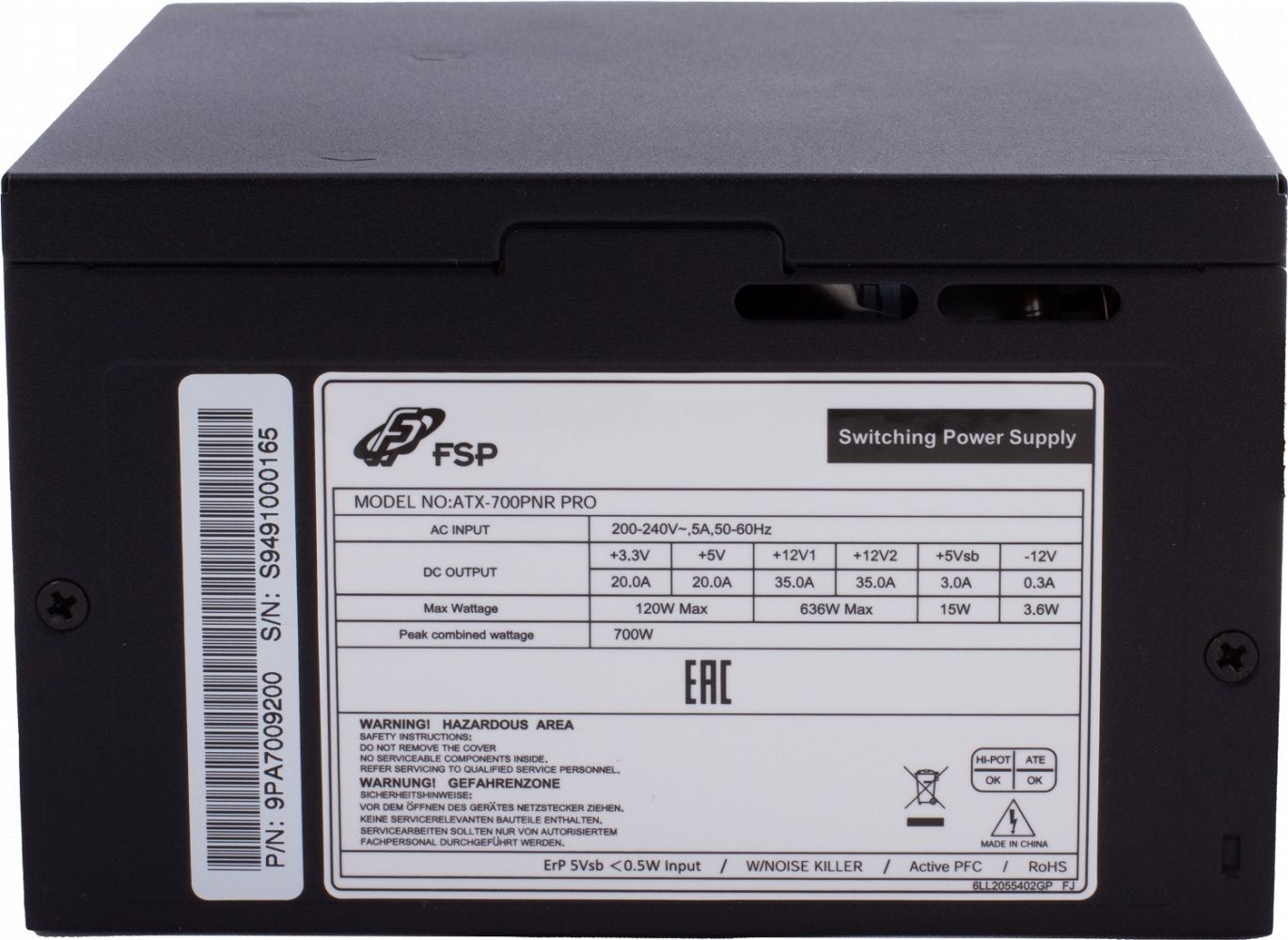 -       Характеристики      КлассификацияТипОбщие характеристикиКод товараATX-700PNR PROМощностьКоличество разъемов доп. питания для видеокартМодульное подключение кабелейТип разъема подключения к материнской платеATX 20+4 pinТип разъема подключения питания процессора1x4+4pinТип разъемов дополнительного питания для видеокарт2x(6+2pin)Количество разьемов для подключения HDD/FDD/SATA2 / 1 / 6ГарантияГарантия: 24 месяцаОхлаждениеДиаметр вентилятора120 ммПитаниеМаксимальные нагрузки+12 В1 - 35 A , +12 В2 - 35 A , +3.3V: 20A , +5 В: 20 A , -12 B: 0.3 A , 5 В sb: 3 АДополнительноОсобые свойстваСертификация 80 Plus , Активный PFC (Коррекция фактора мощности) , OCP (Защита от сверхтоков) , OVP (Защита от повышения напряжения в сети) , SCP (Защита от короткого замыкания) , UVP (Защита от понижения напряжения в сети)Габариты, Цвет, ВесВес1.6 кгШирина140 ммВысота86 ммГлубина150 мм- * Характеристики и комплектация товара могут изменяться производителем без уведомления.