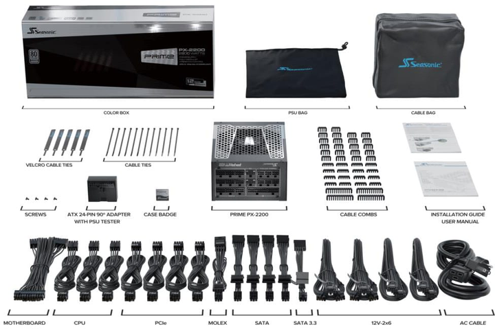 -       Описание      Seasonic Prime PX-2200 ATX 3.1 – это ультрамощный блок питания, разработанный для самых требовательных пользователей, которым нужна максимальная надежность и производительность. Он соответствует новейшему стандарту ATX 3.1 и поддерживает PCIe 5.0, что делает его идеальным решением для высокопроизводительных геймерских ПК, рабочих станций и серверных систем.