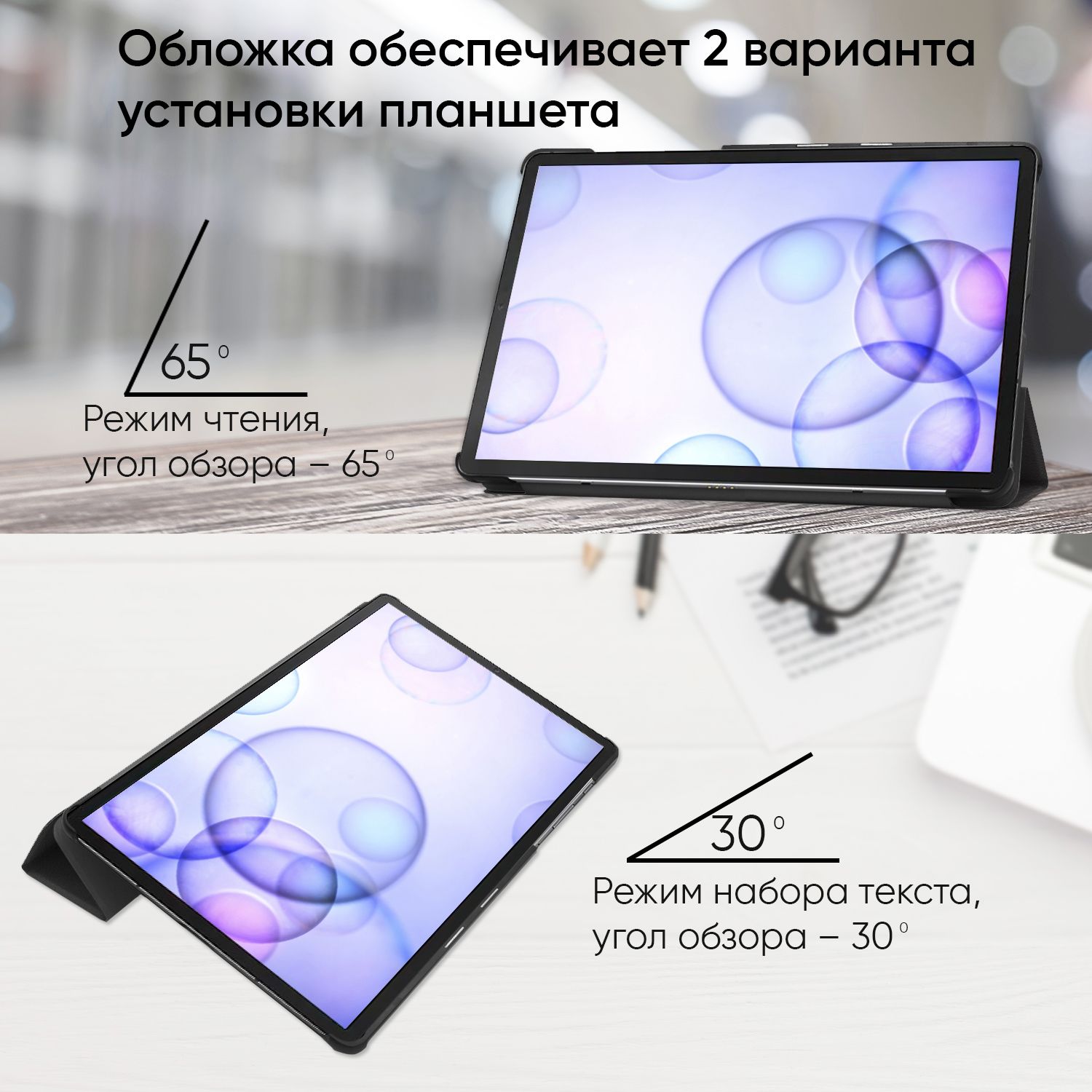 AIRON Premium – это комфорт при подключении зарядного устройства и управлении громкостью. Отверстия в чехле идеально спроектированы и совпадают с разъемами и клавишами на планшете. Еще больше удобства в использовании предоставляет функция подставки. Зафиксируйте чехол с помощью пластиковых вставок в положении 65° или 30° и с комфортом смотрите YouTube или набирайте текст на сенсорной клавиатуре.