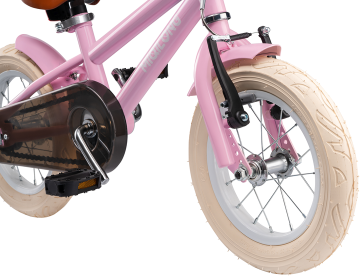 Диск колеса 12` традиционный, спицевый с классической втулкой на подшипниках. Высокий и широкий профиль покрышки обеспечат комфортное катание как по асфальту, так и по неровностями. Колеса дополнительно защищены брызговиками выкрашенными в цвет велосипеда и надежно защитят от грязи и брызг.