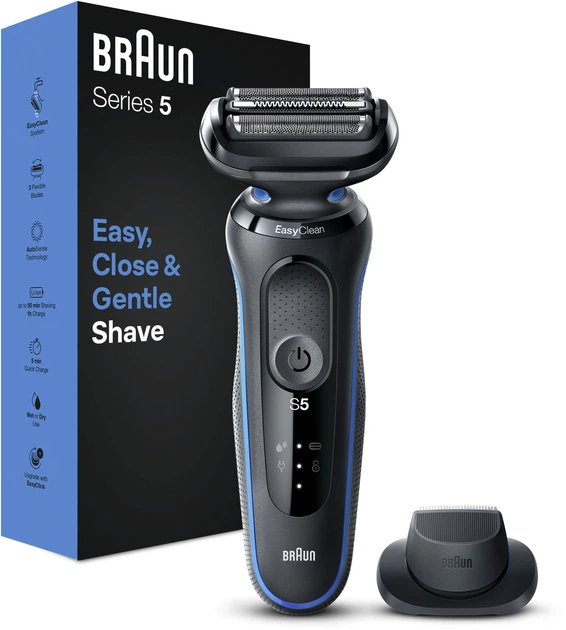 Мужская электробритва Braun Series 5 с 3 плавающими лезвиями для легкого бритья, которое адаптируется к контурам вашего лица. Система EasyClean обеспечивает быструю и легкую очистку, не снимая бритвенную головку. Литий-ионный аккумулятор обеспечивает до 3 недель бритья и быстро заряжается за 5 минут для 1 бритья. Электробритва на 100% водонепроницаема и позволяет как сухое, так и влажное бритье. Совместимо с EasyClick, чтобы расширить возможности вашей бритвы.