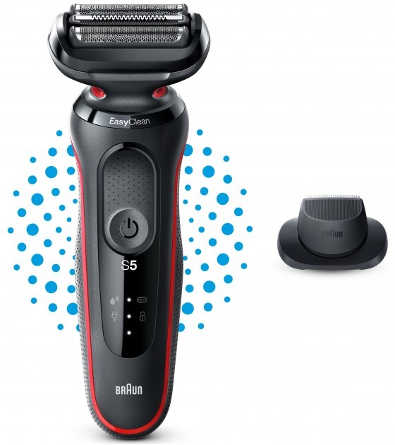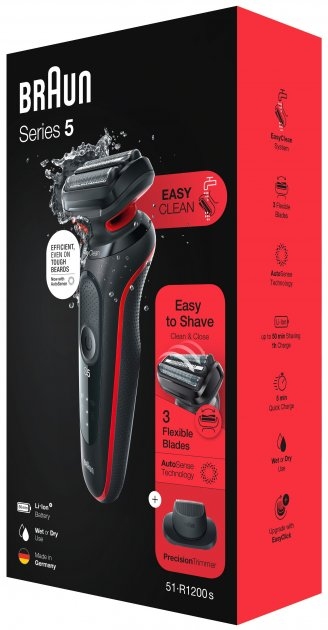 Braun Series 5 51-R1200s BLACK / RED - гладкое бритье стало проще: 3 гибких лезвия этой электробритвы плавно повторяют контуры вашего лица, а система EasyClean позволяет быстро и легко чистить, не снимая бритвенную головку. Эффективен даже при жесткой щетине: технология AutoSense анализирует щетину и регулирует мощность в зависимости от ее густоты, захватывая и подравнивая больше волос при каждом бритье. В комплект входит насадка для точного подравнивания усов и бакенбардов.