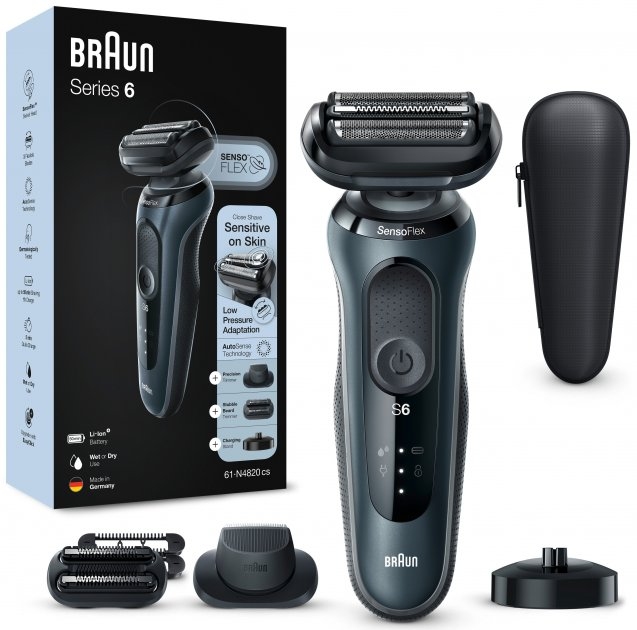 Braun Series 6 61-N4820cs - точность и комфорт для кожи: дерматологически протестированная поворотная головка SensoFlex и лезвия SensoFoil предназначены для минимизации давления на чувствительную кожу. Эффективен даже при жесткой щетине: технология AutoSense анализирует щетину и регулирует мощность в зависимости от ее густоты, захватывая и подравнивая больше волос при каждом бритье. В комплект входят: зарядная база, насадка для высокоточного триммера, насадка для многодневного триммера.