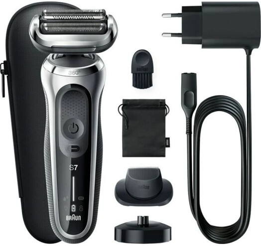 Braun Series 7 71-S4200cs SILVER / BLACK - электробритва обеспечивает гладкое бритье даже в труднодоступных местах благодаря вращающейся на 360° головке. Эффективен даже при жесткой щетине: технология AutoSense анализирует щетину и регулирует мощность в зависимости от ее густоты, захватывая и подравнивая больше волос при каждом бритье.