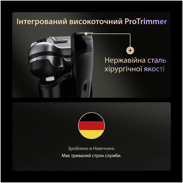 Встроенный триммер из нержавеющей стали для точной коррекции усов, бакенбард и длинной щетины.