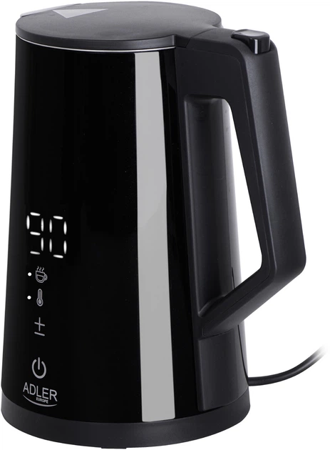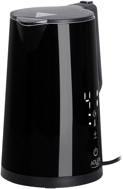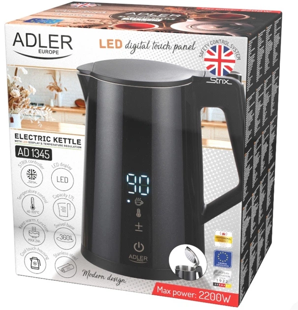 Чайник Adler AD 1345 – многофункциональный чайник мощностью 1850-2200 Вт и объемом 1,7 л. Он поддерживает регулировку температуры воды (40°C/55°C/80°C/90°C/100°C) и поддержание тепла в диапазоне 40-100°C в течение 24 часов.