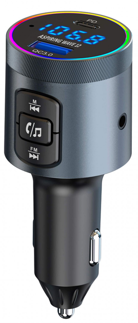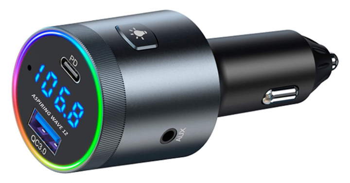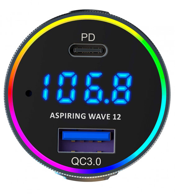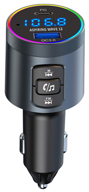FM-трансмиттер Aspiring Wave 12 выполнен в классическом стиле и оснащен портами для быстрой зарядки: QC 3.0 (18W) и Type-C PD (30W), что позволяет одновременно заряжать два устройства с максимальной эффективностью.Это компактное устройство предназначено для преобразования звукового сигнала из источника (например, телефона) и трансляции его в FM-диапазоне в главное устройство автомобиля, где он воспроизводится через стандартную акустическую систему. Модулятор работает в диапазоне 87,5–108,0 МГц, передает сигнал на расстояние 5–10 метров без потери качества в зависимости от помех.