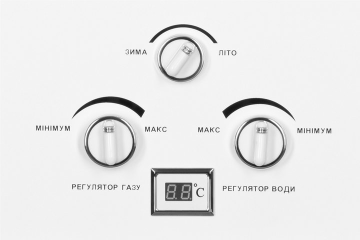 На лицевой стороне колонки расположены регуляторы газа и воды, благодаря которым можно настроить подогрев воды до комфортной температуры. Удобство использования обеспечивает LCD-дисплей, на котором отображается температура воды на выходе из газовой колонки. Режим «ЗИМА/ЛЕТО» создает дополнительный комфорт при использовании устройства.