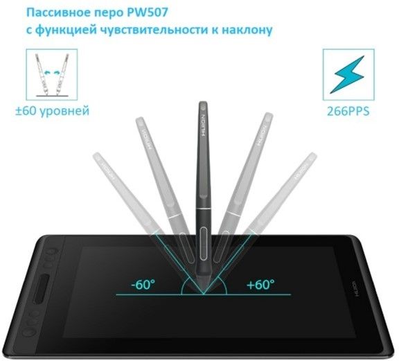 - Наклон пера ±60 уровней: чувствительность к наклону благодаря стилусу Huion PW507, рисование аналогично традиционным кистям, карандашам и маркерам.