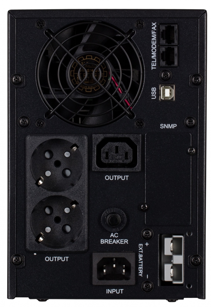 При весе 11,6 кг устройство имеет размер 144 × 345 × 215 мм. Тип установки: TOWER. Уровень шума – 50 дБ. Изделие имеет функции «холодный старт» и «рестарт», защиту от короткого замыкания, перегрузки, перегрева, полной разрядки аккумулятора. Самотестирование, автоматический заряд АКБ, если ИБП подключен к сети, ECO режим экономии электроэнергии.