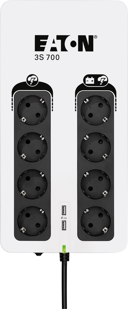 -       Описание      Eaton 3SИБП Eaton 3S Gen2 — это доступные и надежные ИБП для дома и малого бизнеса. Резервный ИБП обеспечивает защиту от перенапряжений и устойчивое электропитание для интернет-шлюзов, настольных компьютеров и другой важной электроники. Высококлассная защита от скачков напряженияEaton 3S Gen2 обеспечивает резервное питание на время отключения электрической сети и надежную защиту от скачков напряжения подключаемого электрооборудования, предотвращая его повреждение от ударов молнии и других импульсных перенапряжений в сети. Схемы защиты от перенапряжений соответствуют международному стандарту ГОСТ IEC 61643-11 («Устройства защиты от перенапряжений низковольтные»), что подтверждает высокое качество защиты от перенапряжений. Eaton 3S Gen2 имеет разъемы RJ11/xDSL для защиты интернет-шлюзов от неполадок на линии передачи данных. Зарядка через порт USBEaton 3S Gen2 700 ВА и 850 ВА имеют по два USB-порта 2 A для зарядки мобильных устройств (телефон, планшет и т.д.). Современный дизайнБлагодаря плоскому дизайну 3S Gen2 будет отлично смотреться с вашим высокотехнологичным оборудованием. Этот компактный ИБП также можно размещать на стене или на столе, если нужно сэкономить пространство. - * Характеристики и комплектация товара могут изменяться производителем без уведомления.