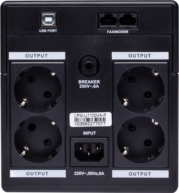 К ИБП LogicPower LPM-U1100VA-P можно одновременно подключить четыре единицы техники суммарной мощностью до 770 Вт. Тип подключения – стандартная розетка (европейского типа).