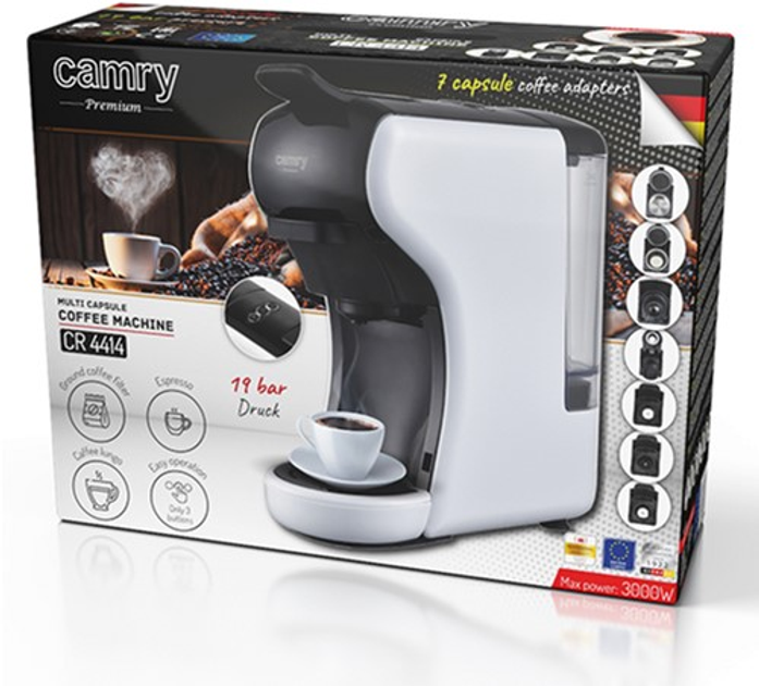 Капсульная кофеварка Camry CR-4414 — это универсальное решение для любителей кофе, которое поддерживает 9 популярных типов капсул: Nespresso®, Dolce Gusto®, Lavazza Blue®, Lavazza Modo Mio®, Caffitali®, Tchibo Cafissimo®, Jacobs® (только малые капсулы), Lor® и ESE®. В комплект входят 5 сменных адаптеров для капсул, а также адаптер для молотого кофе с двумя фильтрами: один — для эспрессо, маленького кофе или чая в пакетиках, другой — для кофе lungo или большого объема.