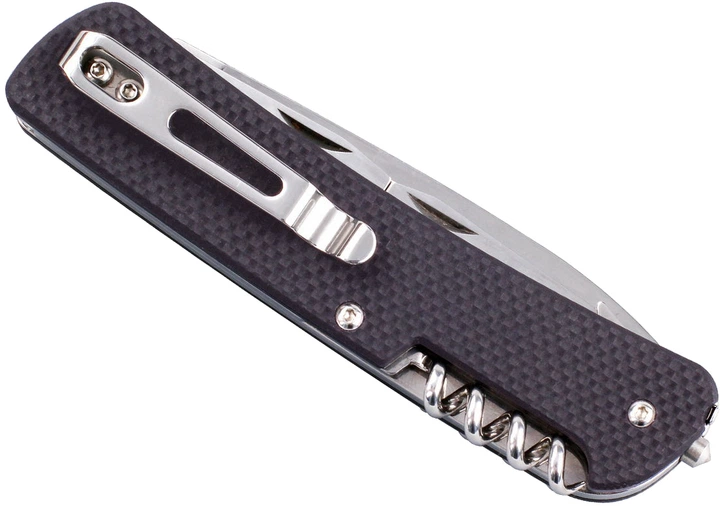 Ruike L31 отлично подойдёт для тех, кто желает получить не просто нож, а по-настоящему универсальный инструмент, который поможет решить широкий список задач как в домашних, так и в полевых условиях. Представленная модель имеет клинок формы Drop-point с гладкой заточкой, длина которого составляет 85 мм, а толщина у обуха — 3,0 мм. Среди дополнительных инструментов присутствуют небольшие подпружиненные ножницы, отвертка с плоским шлицем, совмещенная с открывалкой, многофункциональное шило, лезвие с волнообразной заточкой, откидное «ушко» для крепления темляка, шило и стеклобой, установленный в торцевой части. А в одной из пластин рукояти располагаются съемные металлические щипцы.