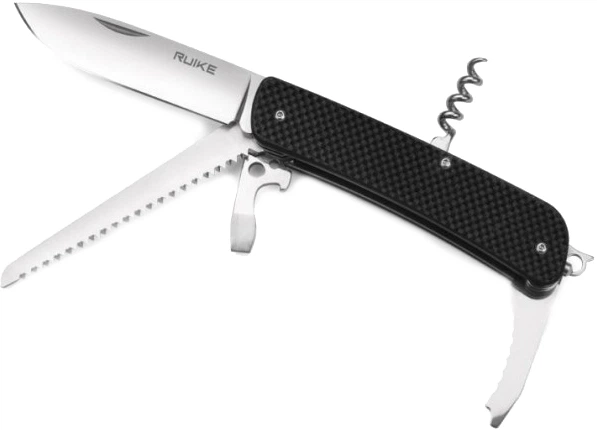Продукция компании Ruike относительно недавно появилась на мировом рынке, однако, уже успела завоевать популярность среди рыбаков, охотников и просто тех, кто ценит качественные ножи. Хорошим примером является модель L32. Представленный нож объединяет в своей конструкции «классический» клинок с гладкой заточкой, небольшую пилу, открывалку, комбинированную с «плоской» отверткой и инструментом для снятия изоляции, стропорез, штопор, откидное ушко для крепления темляк и стеклобой.