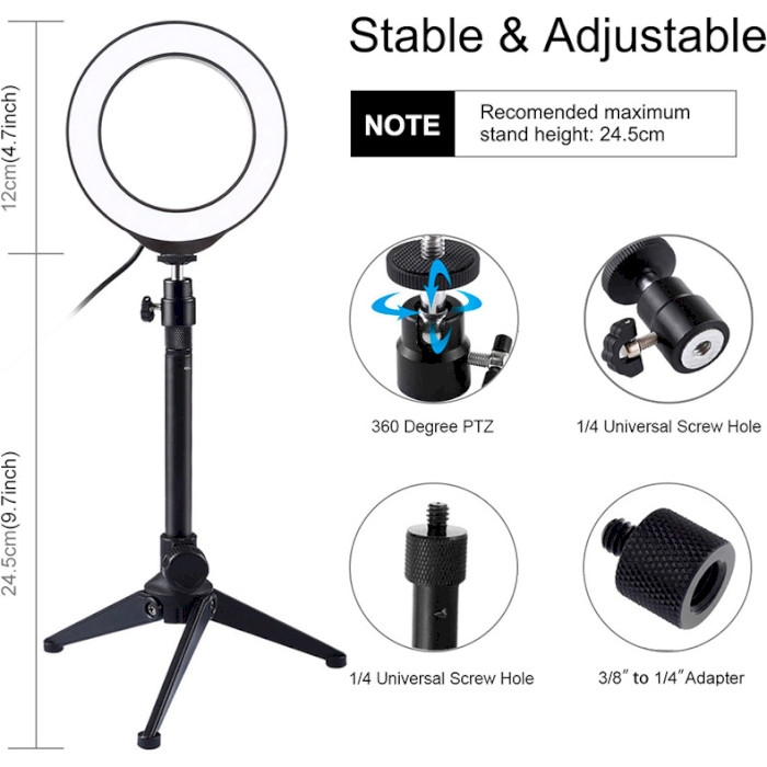 Кольцевая USB LED лампа Puluz PKT3049B 4.7" + настольный штатив можно купить по доступной цене и убедиться в приятном соотношении цены и качества. Угол освещения устройства составляет 120⁰. Также, головку лампы можно устанавливать в любой удобный штатив или держатель.