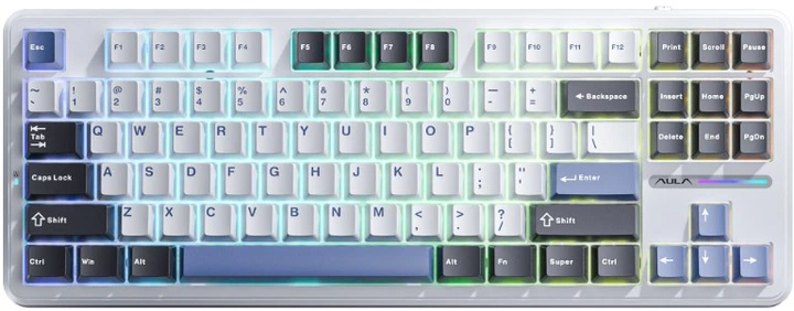 AULA F87 оснащена яркой радужной подсветкой клавиш с динамическими световыми эффектами, что делает ее не только функциональным инструментом, но и стильным аксессуаром на рабочем месте. Пользователи могут настраивать быстрые клавиши и комбинации в соответствии с собственными потребностями и предпочтениями, что значительно повышает производительность.