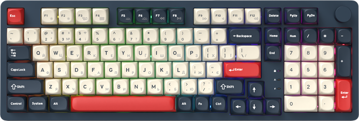 Клавиатура подходит для разнообразных требований и задач. Она имеет полноразмерный формат, который позволяет пользоваться всеми необходимыми клавишами, включая цифровой блок, что является важным преимуществом для работы с большими объемами данных. Благодаря интеграции RGB-подсветки с множеством эффектов, пользователь может персонализировать внешний вид клавиатуры по своим предпочтениям или под настроение игры, что добавляет дополнительную атмосферу процессу.