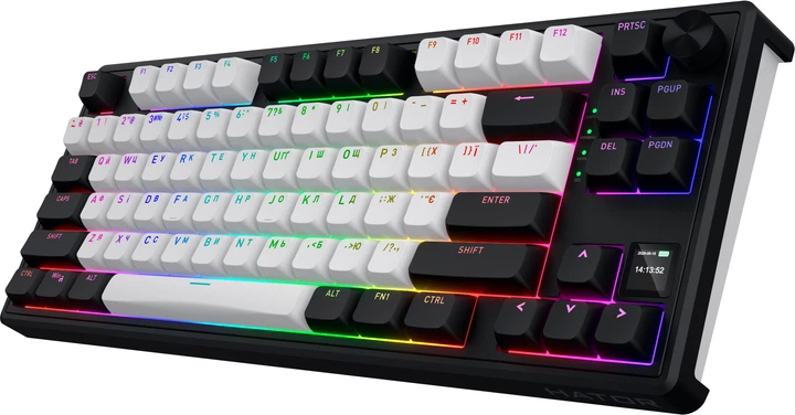 HATOR Skyfall 80 MAG ULTIMA 8K оснащена переключателями HATOR Aurum Ice, которые обеспечивают плавное и тихое нажатие. Подсветка добавляет стильный акцент, а наличие дисплея и регулятора громкости позволяет быстро и удобно управлять настройками без отвлечения от игры. Клавиатура выполнена без цифрового блока, что делает ее компактной и удобной для переноса.