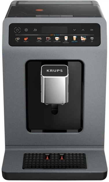 Krups Evidence Hot & Cold EA898GF0 — полностью автоматическая кофемашина «от зерна до чашки», способная готовить как горячие, так и холодные кофейные напитки одним нажатием. С её помощью легко приготовить эспрессо, доппио, американо, капучино, латте, флет-вайт, а также холодные варианты кофе или холодное латте/капучино.
