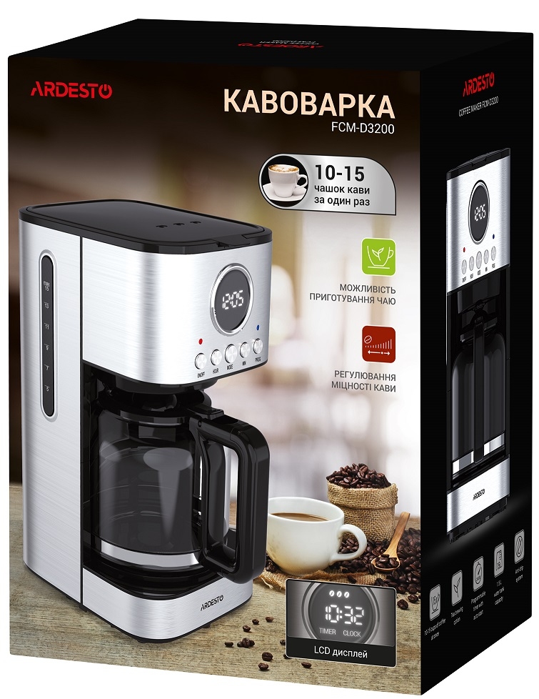 Ardesto FCM-D3200 - капельная кофеварка для молотого кофе с мощностью 900 Вт, таймером приготовления, подогревом кофейника и выбором крепости напитка. Кофеварка FCM-D3100 оснащена сенсорным блоком управления с дисплеем, съемным многоразовым фильтром и поддерживает приготовление чая.