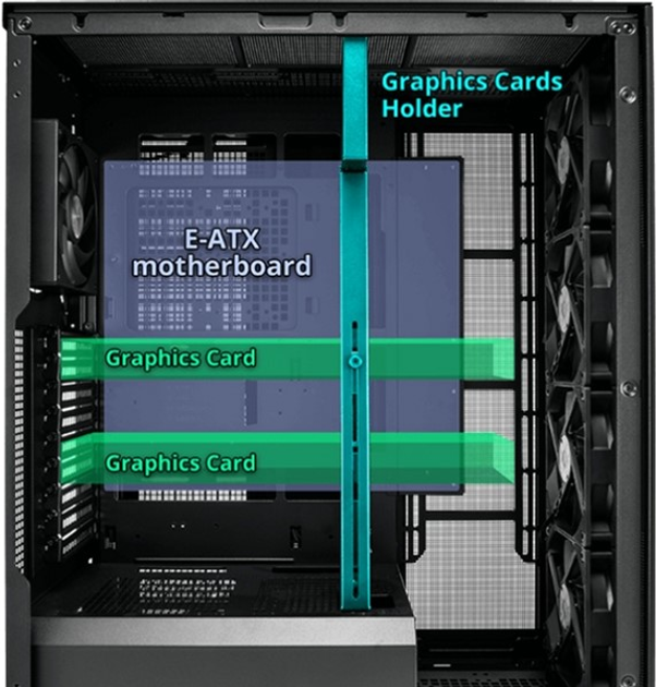 Благодаря просторному внутреннему отделению, U500 предназначен для поддержки широкого спектра материнских плат, включая E-ATX, ATXXX, M-ATX и Mini-ITX. Он также поддерживает две высокопроизводительные видеокарты, что делает его идеальным выбором для мощных и универсальных сборок.