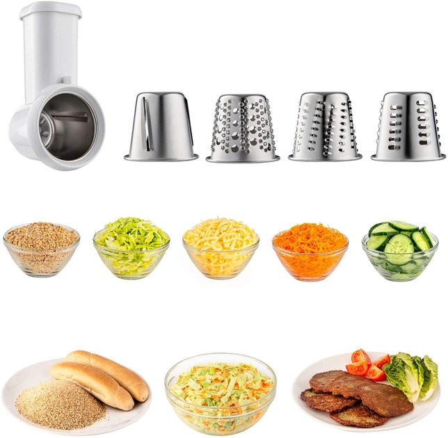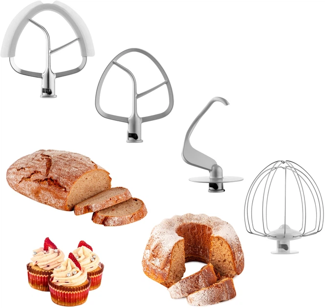 В комплект входят две вместительные чаши из нержавеющей стали объемом 6.5 и 6 литров с мерной шкалой, стеклянный блендер на 1.5 л, мясорубка, кофемолка и измельчитель для кофейных зерен, орехов, трав и специй. Машина комплектуется тремя насадками для затворения и сбивания, гибкой насадкой FLEXI для нежного теста, насадками для приготовления колбас и печенья, шинковательно-терковым модулем с четырьмя конусами, защитной крышкой от брызг и чехлом для хранения. LED-подсветка чаши добавляет удобства, а мощности прибора достаточно для одновременного взбивания до восьми яичных белков.