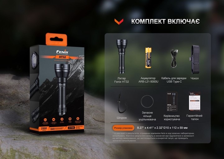 Фонарь Fenix HT32, li-ion аккумулятор ARB-L21-5000U, кабель USB Type-C для зарядки, запасное уплотнительное кольцо, темляк, чехол, инструкция, гарантийный талон.Характеристики: