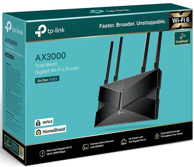 - Описание Бешеные скорости не могут ждатьНет смысла откладывать покупку роутера с Wi‑Fi 6, ведь воспользоваться преимуществами его высокой скорости можно уже сегодня. Благодаря ширине канала в 160 МГц и модуляции 1024‑QAM скорость Archer AX53 может достигать 3 Гбит/с. Наслаждайтесь потоковыми видео и онлайн‑играми как никогда прежде — встроенный мощный двухъядерный чипсет обеспечит одновременную плавную работу нескольких требовательных задач.Wi-Fi во всём домеЧетыре мощные внешние антенны обеспечат Wi-Fi покрытие во всём доме, а технология Beamforming обнаружит подключённые устройства и будет направлять концентрированный сигнал в их направлении — особенно, если они далеко.WPA3 — новый уровень безопасностиНовейший протокол Wi-Fi шифрования WPA3 повышает кибербезопасность домашних сетей. В частности, WPA3 увеличивает надёжность Wi-Fi пароля и защиту от брутфорс-атак.
