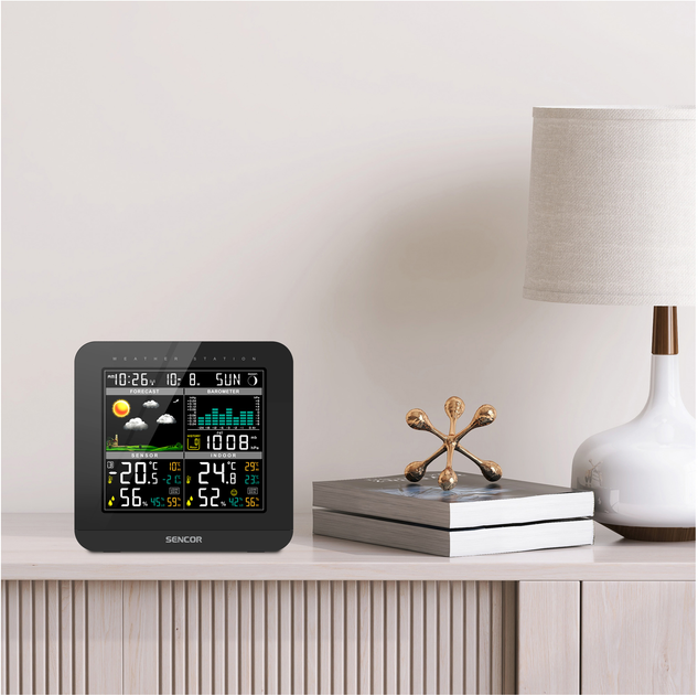 Вы сможете следить за атмосферным давлением как в относительных, так и в абсолютных значениях. Sencor SWS5800 также имеет график барометрического давления, барометрическую историю и тенденции, что поможет вам лучше понимать атмосферные изменения. Эта метеостанция предоставляет показатели температуры и влажности как внутри помещения, так и снаружи. Диапазон температур в помещении варьируется от -10°C до +50°C, тогда как наружная температура измеряется от -20°C до +50°C. Измерение влажности в помещении и на улице охватывает диапазон от 0% до 99% относительной влажности.