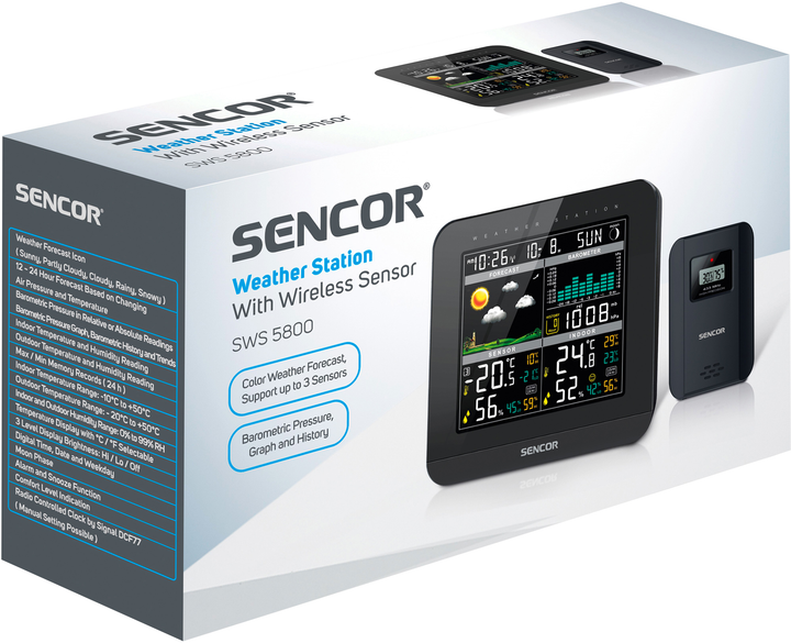 Метеостанция Sencor SWS5800 с беспроводным датчиком - это идеальное решение для точного прогнозирования погоды и мониторинга климатических условий как внутри помещения, так и на улице. Она оснащена значком прогноза погоды, который отображает различные погодные условия: солнечно, переменная облачность, облачно, дождь или снег. Прогноз на 12-24 часа основывается на изменении давления воздуха и температуры, что позволяет вам всегда быть готовым к любым изменениям погоды.