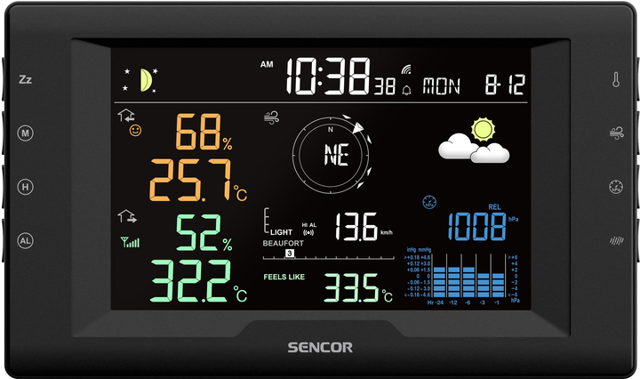 -       Описание      Будьте в курсе событий благодаря точному обновлению погоды. Воспользуйтесь преимуществами современных технологий для получения точной информации о погоде. Благодаря усовершенствованной метеостанции Sencor SWS 9400 вы всегда будете иметь достоверные данные под рукой. Цветной ЖК-дисплей TRUE BLACK (5,7 дюйма) отображает все важные детали, включая 12- или 24-часовой прогноз погоды, в зависимости от ваших предпочтений. Регулируемая яркость обеспечивает легкое чтение. Устройство контролирует текущую температуру, влажность в помещении и улице, а также отслеживает историю осадков с помощью графиков. Вы также можете настроить уведомления, чтобы информировать вас об опасных условиях, таких как сильный ветер или гололед.