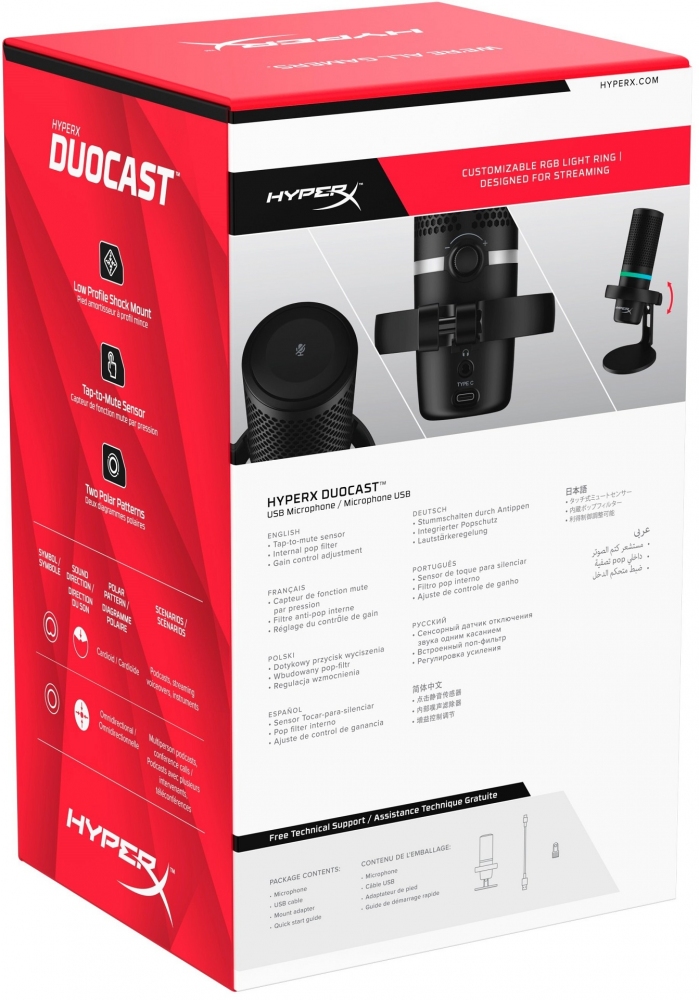 USB микрофон DuoCast разработан с учетом требований профессиональных или начинающих стримеров на ПК, PS5TM, PS4TM и Mac. DuoCast оцифровывает Hi-Res звук с 24-битным разрешением и частотой дискретизации до 96 кГц, что обеспечивает высококачественную и кристально чистую запись голоса. В микрофоне для более чистого захвата звука применен встроенный поп-фильтр. DuoCast оснащен низкопрофильным амортизатором, легкодоступным регулятором уровня, возможностью выбора из двух диаграмм направленности — кардиоидной и ненаправленной — и функцией отключения звука касанием с удобной светодиодной индикацией состояния микрофона. DuoCast также оборудован кольцом с RGB подсветкой, которую можно настроить с помощью программного обеспечения HyperX NGENUITY.