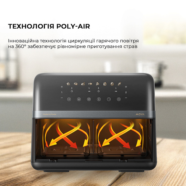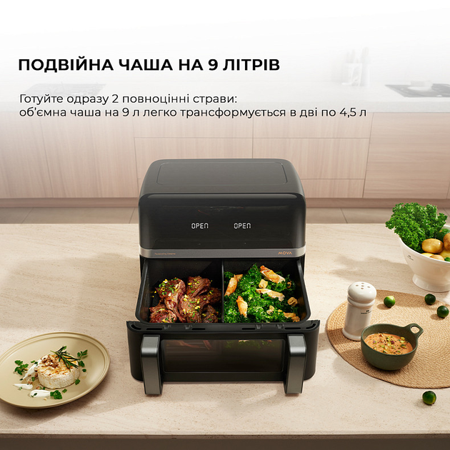 Одно большое, полноценное блюдоГотовьте ингредиенты в полном объеме так же, как в традиционной духовке благодаря цельной емкости для готовки объемом 9л, идеально подходит для семейных обедов, поскольку вместимость позволяет легко разместить 6 и более порций. 2 разных блюда одновременноГотовьте два блюда одновременно при помощи разделённой емкости для готовки по 4.5 литра, что позволяет готовить 2 разных блюда одновременно, что бы разнообразит Ваш стол. Наслаждайтесь здоровой и вкусной пищейFD20 Pro использует на 55% меньше времени и на 75% меньше энергии по сравнению с традиционной духовкой. Между тем, она повышает качество готовки, обеспечивая 85% обезжиривания мяса — идеально даже для фанатов фитнеса. 3D-нагрев для быстрого образования хрустящей корочкиИнновационная система циркуляции 360° Hot Poly-Air использует передовую технологию 3D-нагрева, чтобы обеспечить быстрое получение хрустящей корочки, удерживая влагу, сохраняя внешнюю часть хрустящей, а внутреннюю часть мягкой и нежной. Горячий воздух выходит сверху и циркулирует по всей фритюрнице, а более широкие вентиляционные отверстия сковородок для гриля оптимизируют распределение тепла для быстрого и равномерного получения хрустящей корочки. Настройте работу под каждое блюдоНаслаждайтесь гибкостью настройки различных режимов приготовления для каждого блюда, чтобы адаптировать процесс готовки. Кроме того, режим Sync Finish позволяет готовить оба блюда одновременно, поэтому 2 свежеприготовленных блюда будут горячими и готовыми к подаче на стол. Минимум запахов с помощью металлической внутренней частиДаже при первом использовании MOVA FD20 Pro процесс нагрева не вызывает неприятных запахов. Металлическая внутренняя часть обеспечивает безопасный нагрев, сохраняя при этом оригинальный вкус блюд. 7 предустановленных режимов готовкиFD20 Pro предлагает 7 предустановленных режимов приготовления пищи с простым управлением с помощью сенсорного экрана, что идеально подходит для легкой и быстрой готовки. Кроме того, не стесняйтесь регулировать настройки температуры и времени, чтобы раскрыть свой творческий потенциал на кухне. Наблюдайте за процессом готовкиВключите внутреннюю подсветку, чтобы осветить внутреннее пространство простым нажатием кнопки. Видимое окно позволяет легко наблюдать и контролировать процесс приготовления. Функция паузыФункция автоматической паузы обеспечивает безопасный и эффективный способ добавления соусов или изменения положения ингредиентов во время приготовления. Просто приостановите процесс, вытащив корзину, и затем плавно возобновите его с предыдущими настройками. Антипригарное покрытиеАнтипригарное покрытие емкости для готовки разработан для упрощения очистки и обслуживания, минимизации прилипания остатков пищи и обеспечения простоты обслуживания. - * Характеристики и комплектация товара могут изменяться производителем без уведомления.