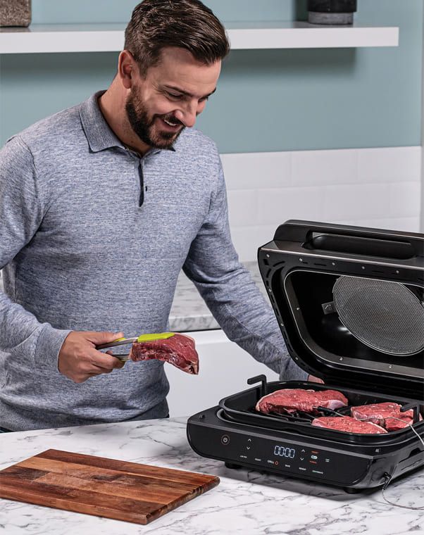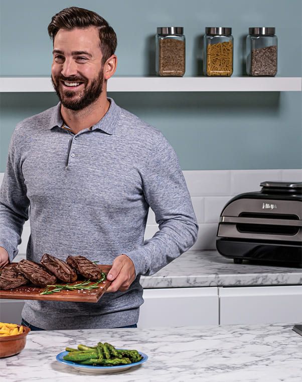 NINJA FOODI MAX HEALTH (AG551EU)Гриль и Фритюрница Ninja Foodi MAX Health будет полезен вам в любой спонтанный праздник или уикенд и ко всему сделает приготовленные блюда неотразимо вкусными и аппетитными. Ninja Foodi легко транспортируется, что позволит воспользоваться ним там где вам удобно, достаточно только установить его на удобную поверхность. Она обязательно станет вашим лучшим решение проблем с уборкой дома. Максимальный комфорт в приготовлении ваших любимых блюд Какую прожарку стейка вы предпочитаете, rare или well done? Гриль и Фритюрница Ninja Foodi приготовит вам так, как нужно, просто выберите желаемый результат и позвольте системе Smart Cook System сделать всю работу за вас! Ninja Foodi MAX Health имеет 6 функций для приготовления — воздушное обжаривание, выпечка, жаркое, подогрев, сушка и гриль. От курицы на гриле до хрустящей картошки — быстро и равномерно готовьте свежие и замороженные ингредиенты, используя минимальное количество масла. Съемная брызгозащитная сетка и зона охлаждения предотвратят распространение жира на нагревательный элемент, а также в разы уменьшают количество дыма. Емкость гриля Ninja Foodi даст возможность приготовить до 6 бургеров одновременно. Ключевые особенности Ninja Foodi MAX Health Больше не нужно беспокоиться о том, доварилось ли блюдо или нет, более того никаких внешних повреждений, чтобы убедиться, что она готова. Цифровой зонд для приготовления пищи точно отслеживает температуру приготовленных блюд и оповестит вас, когда они будут готовы к употреблению. Готовьте ужин, не нарушая структуру блюд. Технология Cyclonic Air Technology готовит еду максимально быстро и равномерно со всех сторон, без необходимости переворачивания. Мощный вентилятор циркулирует вокруг блюд в камере для гриля при температуре до 260°C, обеспечивая равномерное приготовление пищи и равномерный нагрев. Настройки Low, Medium, High и Max гарантируют идеальные результаты, независимо от того, готовите ли вы из свежих или замороженных продуктов. - * Характеристики и комплектация товара могут изменяться производителем без уведомления.