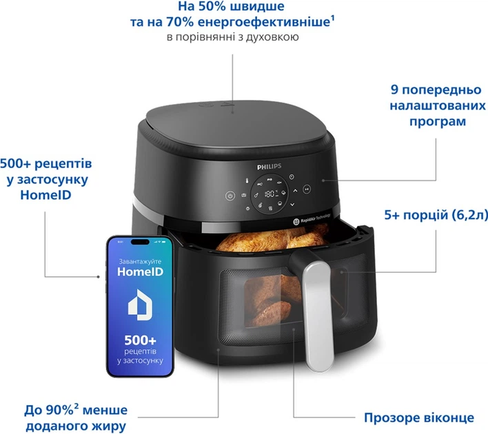 Горячий воздух позволяет готовить ваши любимые блюда с использованием на 90% меньше жира без компромиссов по вкусу.