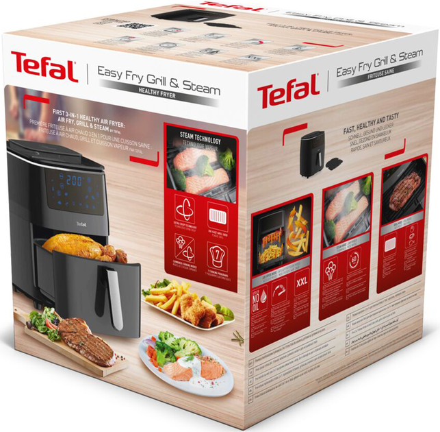Приготовьте разнообразные вкусные и полезные блюда, которые понравятся всем, с помощью Easy Fry Grill & Steam. Это компактное решение «3 в 1» сочетает в себе аэрогриль, гриль и пароварку в одном удобном приборе. В режиме обжаривания добейтесь хрустящей золотистой корочки на всех ваших любимых жареных лакомствах практически без добавления масла. Переключитесь на режим пара и аккуратно приготовьте все, от слоеной рыбы до вкусных овощей, сохраняя при этом витамины и питательные вещества. Или используйте режим гриля с решеткой из литого под давлением алюминия, чтобы поджарить овощи или мясо до нежного и сочного совершенства. Наслаждайтесь 7 автоматическими программами для дополнительного удобства и комбинированного приготовления, а также быстрыми результатами, которые экономят ваше время без предварительного нагрева (в зависимости от режимов приготовления). Благодаря вместимости XXL, TEFAL EASY FRY & STEAM идеально подходит для обильных обедов для всей семьи. Кроме того, он предлагает простой в уходе дизайн, благодаря чему время на кухне не требует усилий!