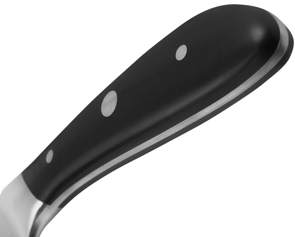 Ножи долго держат заточку. Твердость по шкале Роквелла 54± 2HRC. Высокая сопротивляемость деформации. Эргономичная форма рукоятки обеспечивает удобный захват инструмента и безопасность при работе. Жесткое трехклепочное крепление обеспечивает долговечность. Цельнокованый нож отвечает самым высоким санитарным требованиям. Можно мыть в посудомоечной машине.