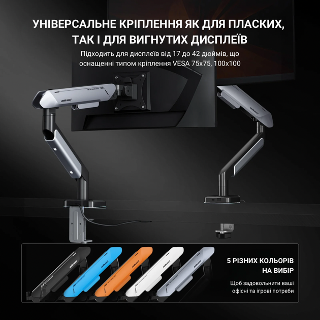 Силиконовые защитные накладки на основе крепежа эффективно защищают ваш стол от возможных повреждений или царапин и гарантируют более надежную фиксацию крепления к столу. С помощью регулировки жесткости наклона можно настроить максимально плавное движение при разном весе монитора.- * Характеристики и комплектация товара могут изменяться производителем без уведомления.