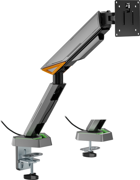 -       Описание      Крепление для монитора Gamepro MAG201G – это сочетание агрессивного дизайна, эргономики и надежной функциональности, созданное специально для геймеров и энтузиастов производительной работы. Поддерживает мониторы с диагональю от 17 до 45 дюймов, включая изогнутые модели с максимальным весом до 16 кг (до 13 кг для изогнутых экранов). Конструкция сделана из комбинации стали, алюминия и пластика. Крепление оснащено встроенной светодиодной подсветкой в основе, которая создает яркую, футуристическую игровую атмосферу и придает визуальную динамику рабочему пространству. Пружинный механизм обеспечивает плавную регулировку: наклон в пределах ±60°, поворот в пределах ±90° и вращение на 180°, что позволяет быстро адаптировать положение экрана под потребности пользователя. Поддержка стандартов VESA 75×75 и 100×100 обеспечивает совместимость с большинством современных мониторов. Крепление устанавливается с помощью струбцины или сквозного отверстия на столешницах толщиной от 10 до 80 мм. Быстросъемная VESA-пластина облегчает монтаж, а встроенная система скрытой прокладки кабелей позволяет поддерживать порядок на столе. Это идеальное решение для тех, кто стремится соединить функциональность, стиль и визуальный эффект в своей игровой или рабочей зоне. - * Характеристики и комплектация товара могут изменяться производителем без уведомления.