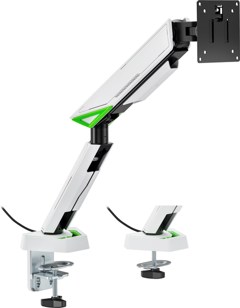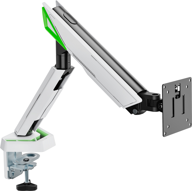 -       Описание      Крепление для монитора Gamepro MAG201W – это сочетание агрессивного дизайна, эргономики и надежной функциональности, созданное специально для геймеров и энтузиастов производительной работы. Поддерживает мониторы с диагональю от 17 до 45 дюймов, включая изогнутые модели с максимальным весом до 16 кг (до 13 кг для изогнутых экранов). Конструкция сделана из комбинации стали, алюминия и пластика. Крепление оснащено встроенной светодиодной подсветкой в основе, которая создает яркую, футуристическую игровую атмосферу и придает визуальную динамику рабочему пространству. Пружинный механизм обеспечивает плавную регулировку: наклон в пределах ±60°, поворот в пределах ±90° и вращение на 180°, что позволяет быстро адаптировать положение экрана под потребности пользователя. Поддержка стандартов VESA 75×75 и 100×100 обеспечивает совместимость с большинством современных мониторов. Крепление устанавливается с помощью струбцины или сквозного отверстия на столешницах толщиной от 10 до 80 мм. Быстросъемная VESA-пластина облегчает монтаж, а встроенная система скрытой прокладки кабелей позволяет поддерживать порядок на столе. Это идеальное решение для тех, кто стремится соединить функциональность, стиль и визуальный эффект в своей игровой или рабочей зоне. - * Характеристики и комплектация товара могут изменяться производителем без уведомления.