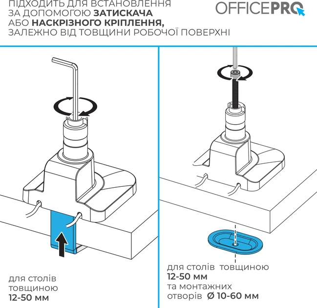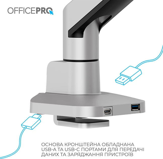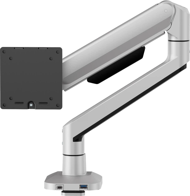 Установка максимально простая — благодаря быстросъёмной VESA-панели и упрощённому монтажу поверх столешницы. Встроенные порты USB-A и USB-C в основании позволяют быстро заряжать устройства или передавать данные непосредственно с рабочего места.