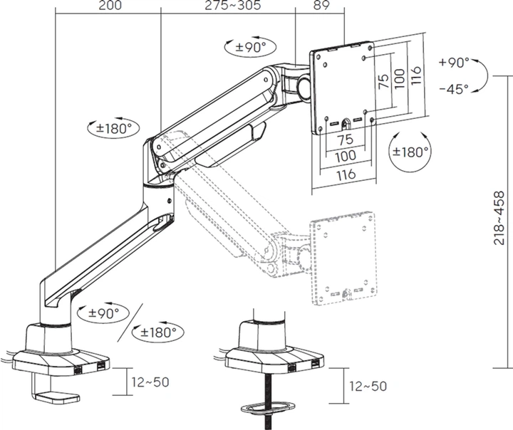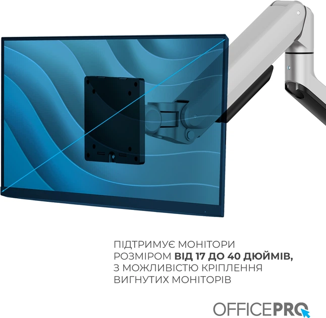 Пружинный механизм обеспечивает идеальную балансировку веса монитора (от 2 до 12 кг), а возможность поворота, наклона и вращения позволяет настроить экран под любой угол обзора. Крепление совместимо с изогнутыми мониторами диагональю от 17″ до 40″ и поддерживает стандарты VESA 75×75 и 100×100.