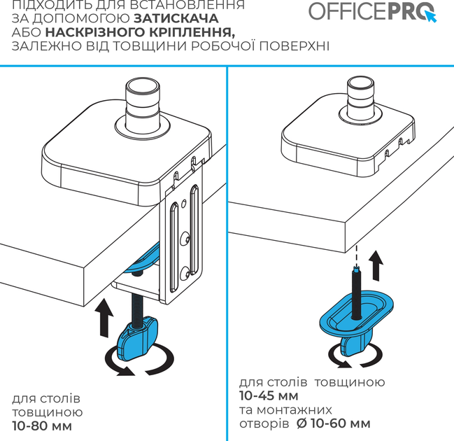 Крепление совместимо с изогнутыми мониторами и поддерживает нагрузку от 2 до 12 кг. струбцины или сквозного отверстия, обеспечивающего универсальность установки на столешнице толщиной от 10 до 80 мм.
