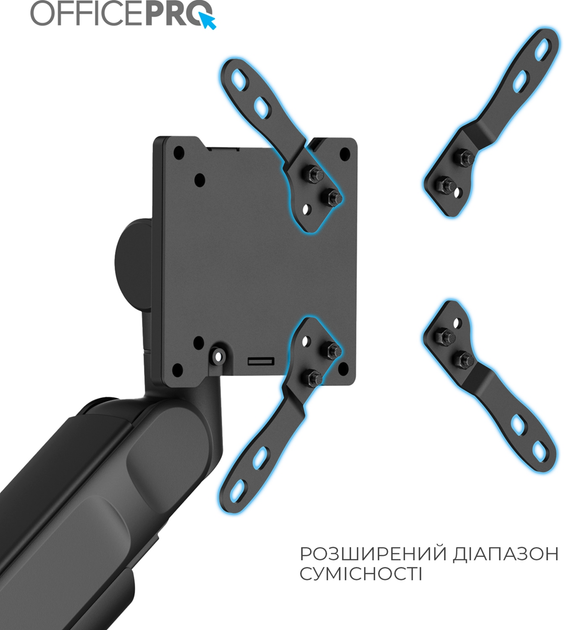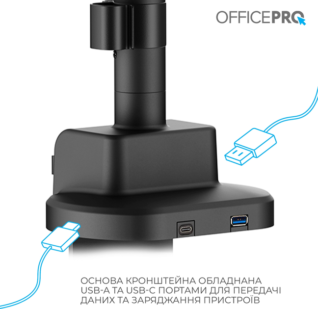 -       Описание      Крепление для монитора Officepro MAH751B с пневматическим механизмом – это премиальное решение для поддержки больших экранов, сочетающее мощность, гибкость и эргономику. Подходит для мониторов с диагональю от 24 до 57 дюймов и весом до 27 кг (до 22 кг для изогнутых моделей), что делает его идеальным выбором для профессиональной работы, графического дизайна, финансового анализа или гейминга. Благодаря пневматическому механизму (газлифт) крепление обеспечивает плавную и точную регулировку: наклон в пределах от -20° до +60°, поворот на 90° влево/вправо, а также полное вращение экрана на 90°. Совместимость с широким спектром VESA-креплений (75x100 200x100, 200x200) обеспечивает универсальность устройства. Монтаж возможен двумя способами – с помощью струбцины или сквозного крепления, позволяющего устанавливать крепление на столешнице толщиной от 10 до 50 мм. Быстросъемная пластина VESA значительно упрощает процесс установки монитора. Встроенные USB-порты (1xUSB 3.0 и 1xType-C) обеспечивают удобный доступ к зарядке устройств или подключению аксессуаров, а скрытая система прокладки кабелей помогает поддерживать порядок и профессиональный вид рабочего пространства. Это крепление – идеальный выбор для тех, кто ищет мощное и гибкое решение для одного большого монитора. - * Характеристики и комплектация товара могут изменяться производителем без уведомления.